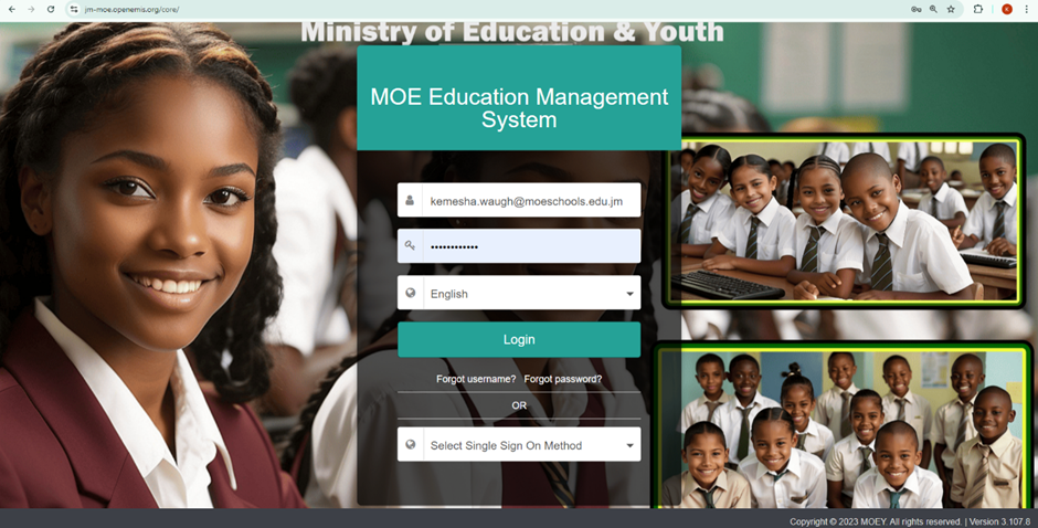 - Username: Your MOE school's email (e.g. firstname.lastname.r1@moeschools.edu.jm).